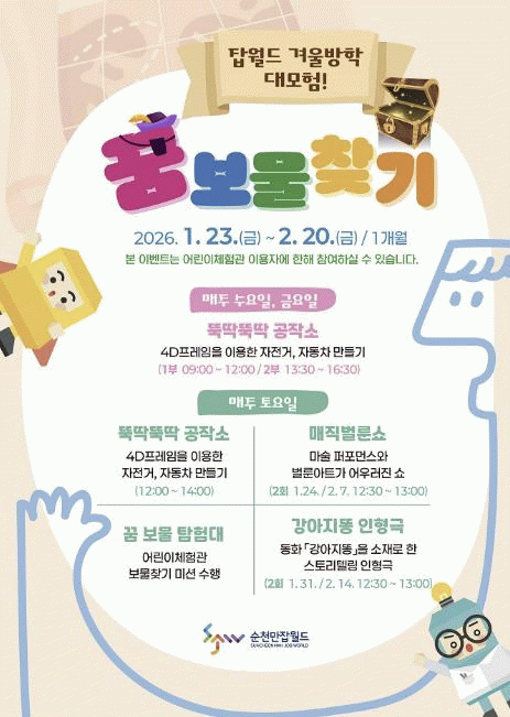 [호남미디어협의회]순천시는 오는 1월 23일부터 2월 20일까지 한 달간 겨울방학을 맞아 순천만잡월드에서 '겨울방학 대모험! 꿈 보물찾기' 이벤트를 개최한다.