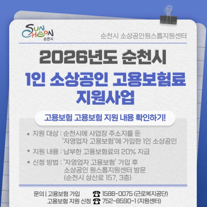 [호남미디어협의회]순천시는 지역 내 1인 소상공인의 경영안정과 사회안전망 강화를 위해 ‘2026년 1인 소상공인 고용보험료 지원사업’을 19일부터 본격 시행한다고 밝혔다.