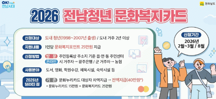 [호남미디어협의회]전라남도가 지역 청년의 문화 향유와 자기계발 기회를 넓히기 위해 19~28세 청년에게 연 25만 원을 지원하는 ‘전남 청년 문화복지카드’ 신청을 3월 말까지 접수한다.