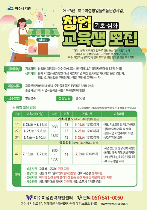 2026년 여수여성창업플랫폼운영 창업 교육생 모집 포스터