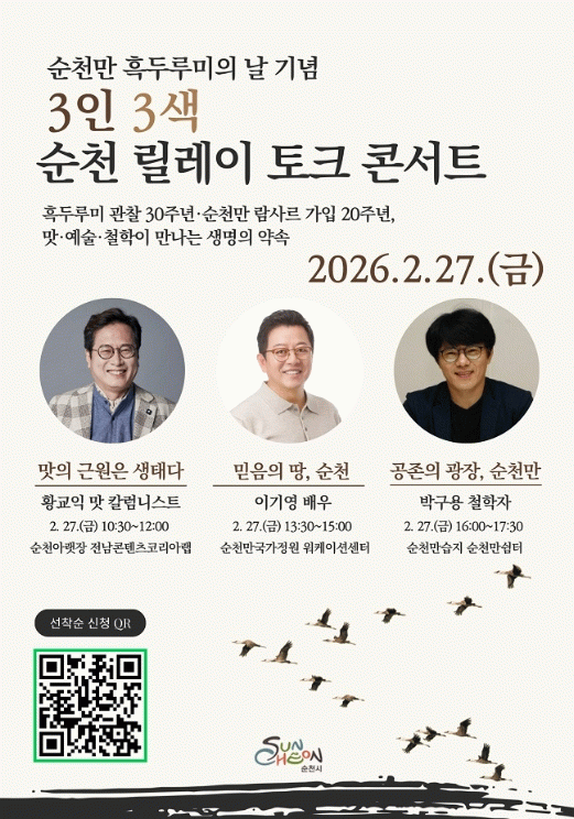 [호남미디어협의회]순천시는 2월 27일부터 3월 2일까지 ‘2026 순천만 흑두루미의 날’을 맞아 '3인 3색 순천 릴레이 토크 콘서트'와 '순천만 치유·탐조 프로그램'을 운영한다고 밝혔다.