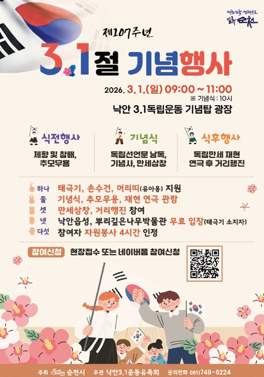 [호남미디어협의회]순천시는 오는 3월 1일 오전 10시, 낙안3.1독립운동기념탑 광장에서 제107주년 3.1절 기념행사를 개최한다고 밝혔다.
