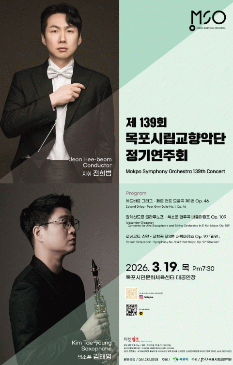 [호남미디어협의회]목포시립교향악단이 오는 3월 19일 오후 7시 30분, 목포시민문화체육센터 대공연장에서 제139회 정기연주회를 선보인다.