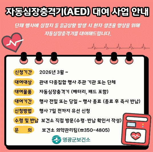 [호남미디어협의회]영광군은 오는 3월부터 다중이 모이는 행사에서 발생할 수 있는 심정지 등 응급상황에 대비하기 위해 자동심장충격기(AED) 대여 사업을 추진한다고 밝혔다.