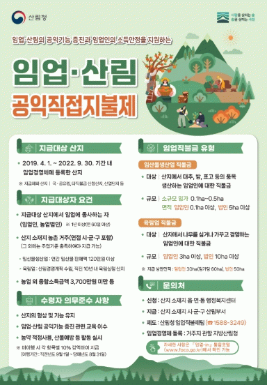 임업직불제는 산림의 공익적 기능을 증진하고 임업인의 소득 안정을 도모하기 위해 마련된 제도다. 지급 대상 산지에서 대추‧호두‧밤 등 임산물을 생산하거나, 나무를 심고 가꾸는 육림업에 종사하는 임업인에게 지급한다.