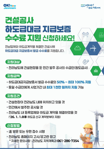 [호남미디어협의회]전라남도가 건설산업 활력을 높이고 하도급 업체 보호를 위해 ‘2026년 건설공사 하도급대금 지급보증 수수료 지원사업’을 확대 추진한다.