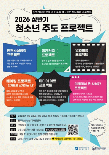 공모 접수는 3월 4일 오후 3시부터 3월 31일 오후 3시까지 국가문화예술지원시스템(NCAS)을 통해 온라인으로 진행된다. 자세한 내용은 광주문화재단 누리집에서 확인할 수 있다.