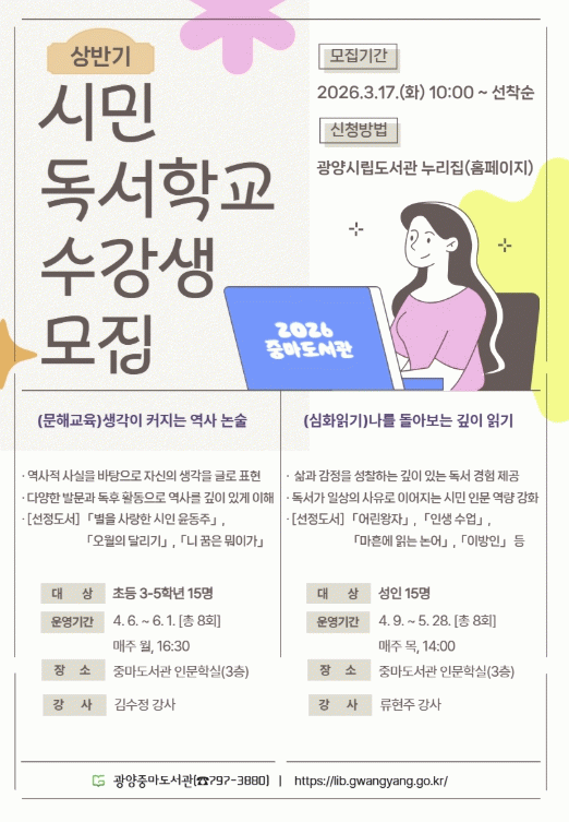 [호남미디어협의회]광양중마도서관이 시민들의 인문 독서 역량을 높이고 독서를 통해 사유와 소통의 기회를 제공하기 위해 ‘2026년 상반기 시민독서학교’ 프로그램 수강생을 모집한다.