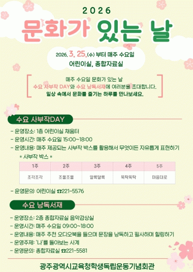 프로그램은 ‘수요 낭독서재’와 ‘수요 사부작 DAY’ 등 2개로 나눠 운영된다.