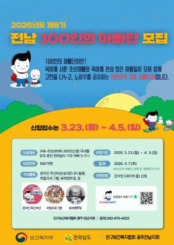[호남미디어협의회]전라남도는 아빠의 육아 참여를 확대하고 가족 중심의 건강한 양육문화를 확산하기 위해 2026년 제8기 전남 100인의 아빠단 참여자를 모집한다.