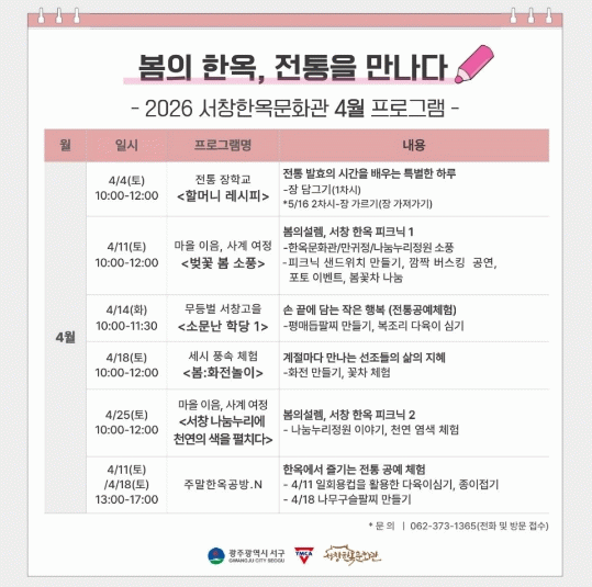 허성자 체육관광과장은 “서창한옥문화관을 전통문화 체험과 지역 관광을 잇는 문화 거점으로 만들겠다”며 “봄기운 가득한 서창에서 소중한 사람들과 특별한 추억을 만들길 바란다”고 말했다.