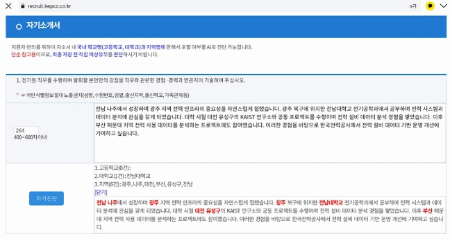 [호남미디어협의회]한국전력이 채용 지원자의 편의를 높이고 공정한 채용 환경을 조성하기 위해, 자기소개서 AI 자가 진단과 네이버 인증 기반 자격증 자동 반영 서비스를 채용 시스템에 전격 도입한다.