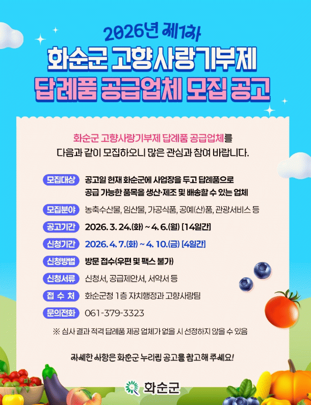 화순군, 2026년 고향사랑기부제 답례품 공급업체 모집