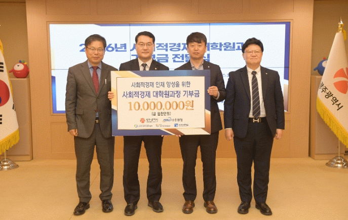 광주광역시는 27일 시청 비즈니스룸에서 ‘사회적경제 대학원과정 지원사업 기부금 전달식’을 열어 다우환경 이정일 대표로부터 기부금 1000만원을 전달받았다. 행사에는 김영문 문화경제부시장과 이정일 대표, 김도경 조선대학교 대학원장 등이 참석했다.