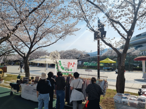 서시천체육공원 잔디광장에는 간이 텐트와 돗자리, 양산 등을 갖춘 휴식 공간이 마련됐고, 방문객들은 봄날 야외 나들이를 즐기듯 장터를 둘러봤다.