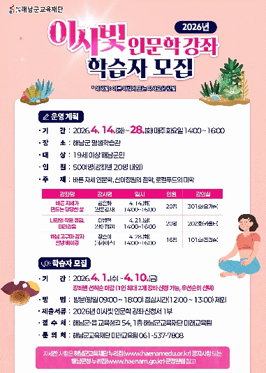 [호남미디어협의회]해남군교육재단은 4월 14일부터 28일까지‘해남 이사빛 인문학 강좌’를 운영한다.‘이사빛’은‘이른 아침 따스하게 비추는 햇빛’을 의미하며 따뜻하고 친근한 인문학의 빛을 전하는 군민 교육과정이다.