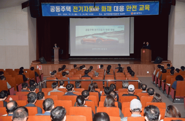 지하에 전기차 충전설비가 설치된 458개 공동주택 관리소장 및 안전관리자, 시·구 관련부서 공무원을 대상으로 한 이번 교육에는 최양주 광주소방본부 교수가 ▲전기자동차 화재 특성 ▲화재 예방법 ▲화재 발생 때 소방시설을 활용한 안전한 대응방법 ▲입주민의 피난 행동 요령 등을 교육했다.