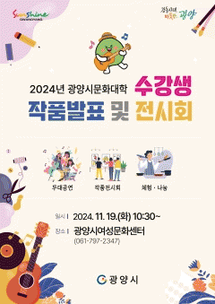 [호남미디어협의회]광양시는 11월 19일 오전 10시 30분 여성문화센터에서 ‘2024년 광양시 문화대학 수강생 작품발표회’가 개최될 예정이라고 8일 밝혔다.