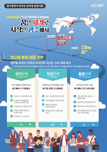 특히 광주글로벌허브센터 설립, 지역대학 공동 해외유학 박람회 추진, 거점 한국어센터 구축, 지역 맞춤형 교육과정 운영, 산업 연계 인턴십 및 창업 지원, 맞춤형 체류비자 사업 추진 등 외국인 유학생 유치부터 지역 정착까지 전 주기를 지원하는 체계를 구축한다.