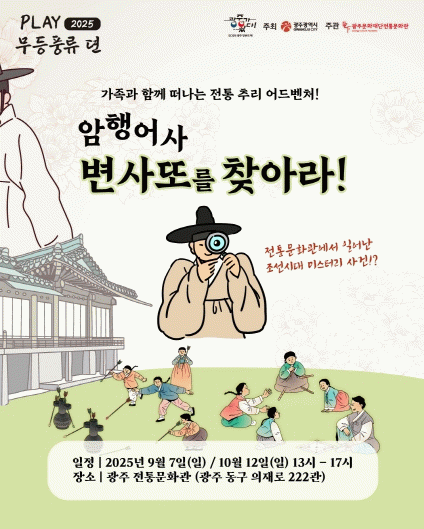 [호남미디어협의회]광주문화재단(대표이사 노희용) 전통문화관은 오는 9월 7일 오후 1시, 전통문화관에서 2025년 세 번째 ‘PLAY 무등풍류 뎐’ 프로그램을 개최한다. 이번 행사는 '조선으로의 시간여행-암행어사, 변사또를 찾아라!'라는 주제로, 관람객들에게 조선시대 마을의 일상을 생생히 체험할 수 있는 몰입형 역사 콘텐츠를 선보인다.
