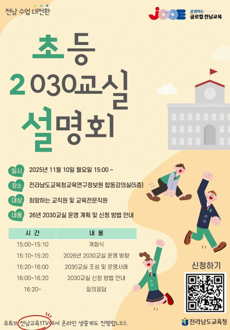 이와 관련해 전남교육청은 오는 10일 오후 3시 전라남도교육청교육연구정보원에서 ‘초등 2030교실 설명회’를 열어 2026학년도 2030교실 운영 계획과 신청 방법을 안내한다.