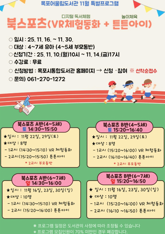 [호남미디어협의회]목포어울림도서관이 11월 특별 프로그램으로 ‘가상현실(VR) 명작동화 체험’과 ‘유아 운동 튼튼아이’를 결합한 '북스포츠' 프로그램을 운영한다.