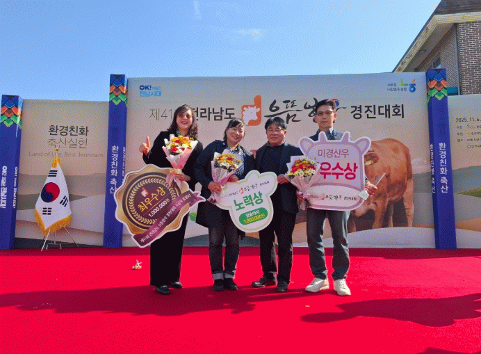 [호남미디어협의회] 곡성군은 지난 6일 순천광양축협에서 열린‘2025년 제41회 전라남도 으뜸한우 경진대회’에서 고급육 부문 옥과면 최하나 농가가“최우수상”, 우량한우(미경산우) 부문 목사동면 조신익 농가가 “최우수상”, 우량한우(암송아지) 부문 겸면 이금숙 농가가 “노력상”을 받는 쾌거를 이뤘다고 10일 밝혔다.