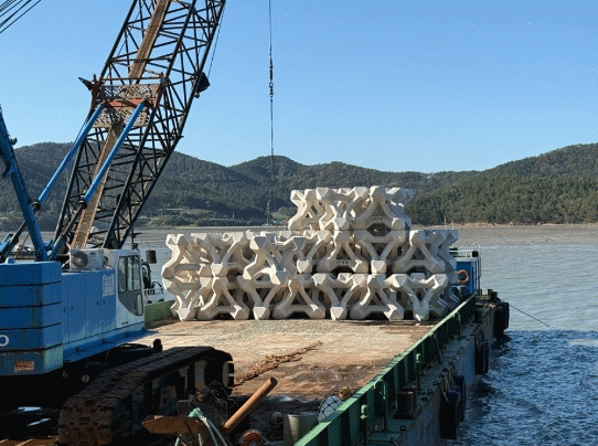 [호남미디어협의회]신안군은 다이아몬드 해역 내 수산자원 산란·서식장 조성 일환으로 지난 9월 인공어초 68개 설치에 이어, 11. 12일 수요일 올해 마지막 인공어초 123개를 추가로 투하했다.
