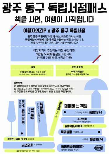 프로그램 참여 방법은 여행자의 집(ZIP)에서 원하는 책방 쿠폰을 수령한 뒤, 해당 서점에서 책을 구매하면 1만 원 도서 지원금 혜택을 받는 방식이다. 서점별로 25명, 총 150명의 참여자를 대상으로 진행된다. 각 서점에서는 책방지기가 직접 선정한 ‘연말 추천도서’ 12권을 만나볼 수 있어, 단순한 구매를 넘어 책과 깊이 있게 만나는 기회를 제공한다.