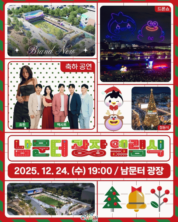 특히 크리스마스 이브를 맞아 엑시트(EXIT)의 캐롤과 디즈니 OST 메들리를 비롯해 씨스타 메들리, 블루문, 안녕 등 히트곡 메이커인 실력파 가수 효린의 목소리로 남문터광장을 채울 예정이다.