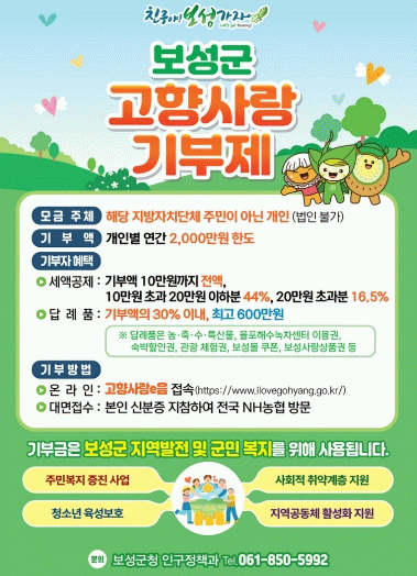한편 보성군은 고향사랑기부제 활성화를 위해 ‘새해 복 더하기 신년 이벤트’를 운영하고 있다. 이번 이벤트는 보성군에 10만 원 이상 고향사랑기부를 한 기부자를 대상으로 하며, 추첨을 통해 총 100명에게 네이버페이를 지급한다.