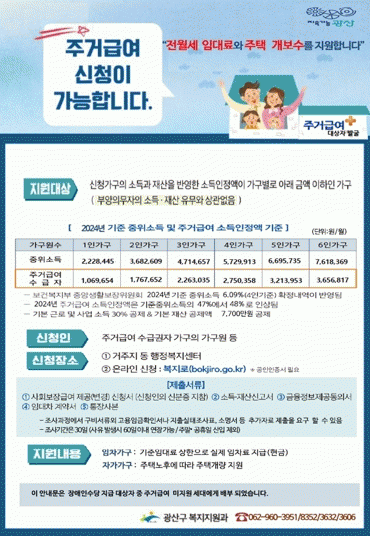 주거급여는 취약계층의 주거 안정과 주거 수준 향상을 위해 전월세 등 임차료를 보조하거나 주택 개보수를 지원하는 사업으로, 광산구는 현재 235억 원의 예산을 투입해 1만 1,027가구에 맞춤형 주거급여를 지급하고 있다.