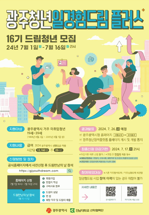 ‘광주청년 일경험드림플러스’는 광주에 주민등록이 돼있는 19 부터 39세(1984년 8월2일생 부터 2005년 8월1일생) 미취업 청년이면 참여가 가능하다.